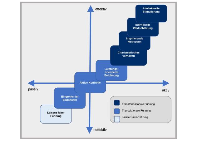 Bass und Avolio postulieren in ihrem Full Range of Leadership Model ein breites Spektrum von Verhaltensweisen einer Führungskraft, die anhand ihrer Aktivität und Effektivität entlang zweier Achsen eingeteilt werden.