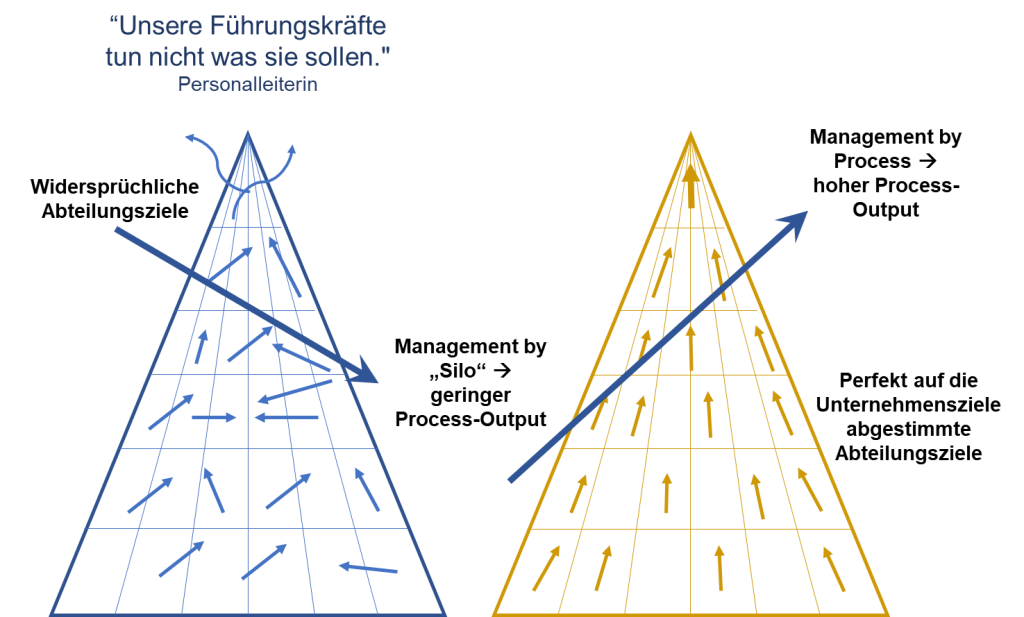 Das ist aber nur ein Aspekt, der sich auf die Arbeit im Unternehmen bezieht. Betrachtet man jedoch – und dies ist mein Thema hier – die Arbeit am Unternehmen, dann kann man schon hier und da ins Grübeln kommen. Wenn Führungskräfte nicht tun, was sie sollen, dann hat das meistens nicht ausschließlich etwas mit den Führungskräften zu tun. Oft genug ist das „Sollen“, sind Unternehmensziele gar nicht festgelegt, oder nicht kommuniziert und/ oder nebulös und widersprüchlich formuliert. Dass in einem solchen Fall die Abteilungsziele widersprüchlich sind, ist daher nur folgerichtig. Um es mit Peter Drucker zu formulieren: „Only three things happen naturally in organizations: friction, confusion, and underperformance. Everything else requires leadership.“