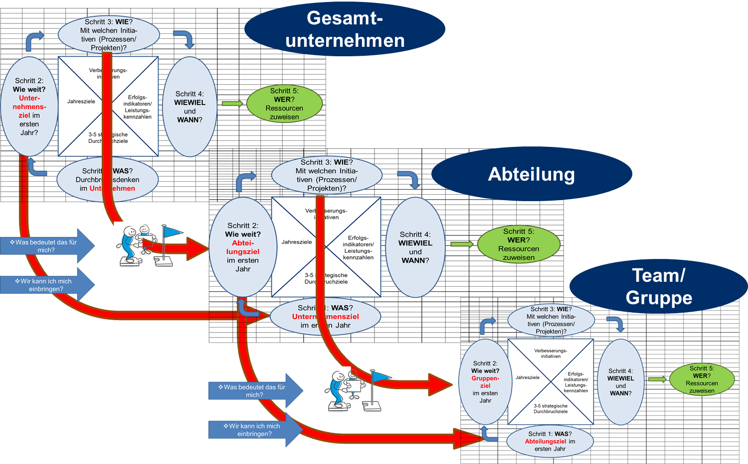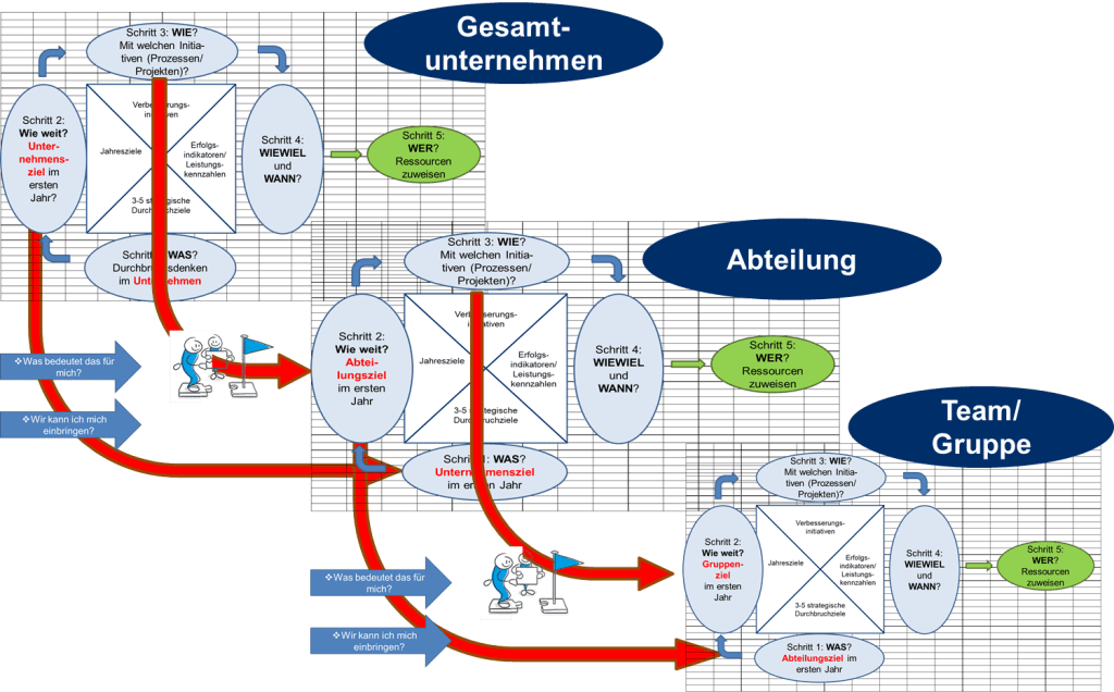 Dieser Schritt ist ebenfalls enorm wichtig, damit kein Ziel und keine Verbesserungsinitiative ein „Waisenkind“ bleibt. Die konsequente und durchgängige Zuweisung von Verantwortlichkeiten erhöht die Umsetzungswahrscheinlichkeit der Verbesserungsinitiativen außerordentlich.