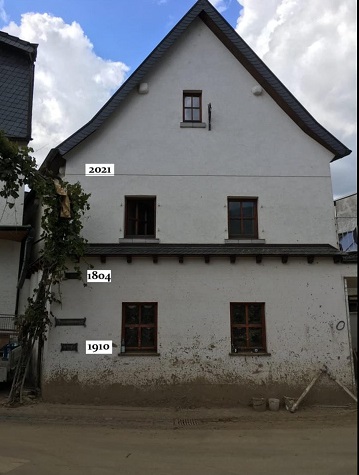 Das Foto links (© W. Kohlhaas) zeigt die Hochwasserstände der Jahre 1804, 1910 und 2021. Wenn es eine Vorstellungslücke gibt oder ein vorstellbares Ereignis mit einer nahe Null zu bemessenden Eintrittswahrscheinlich belegt wird, dann wird man auch keine entsprechende Versicherung abschließen.