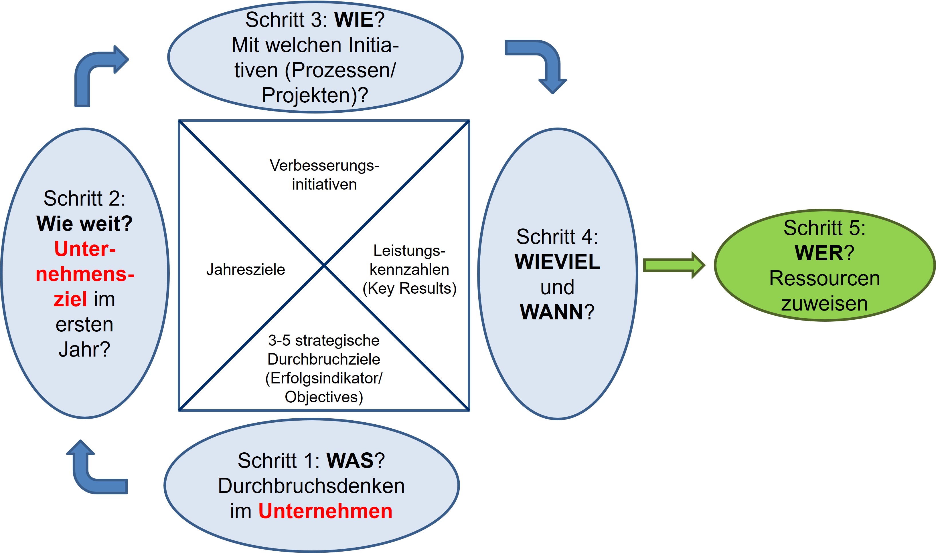 - Kaskadierung der Unternehmensziele auf die einzelnen Bereiche und Teams.