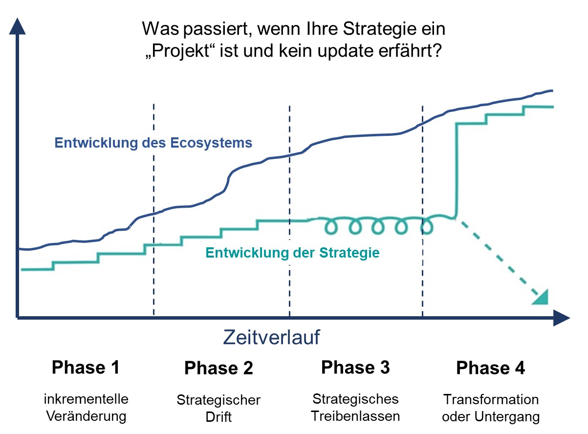 Viele Unternehmen leiden unter der strategischen Drift. Ihre Strategien sind mühsam als Projekt entwickelt worden, schaffen es dann aber nicht, nachhaltig mit den Veränderungen im Umfeld des Unternehmens, dem Ecosystem, Schritt zu halten. Infolgedessen brauchen sie irgendwann den Turnaround, oder sie scheitern.